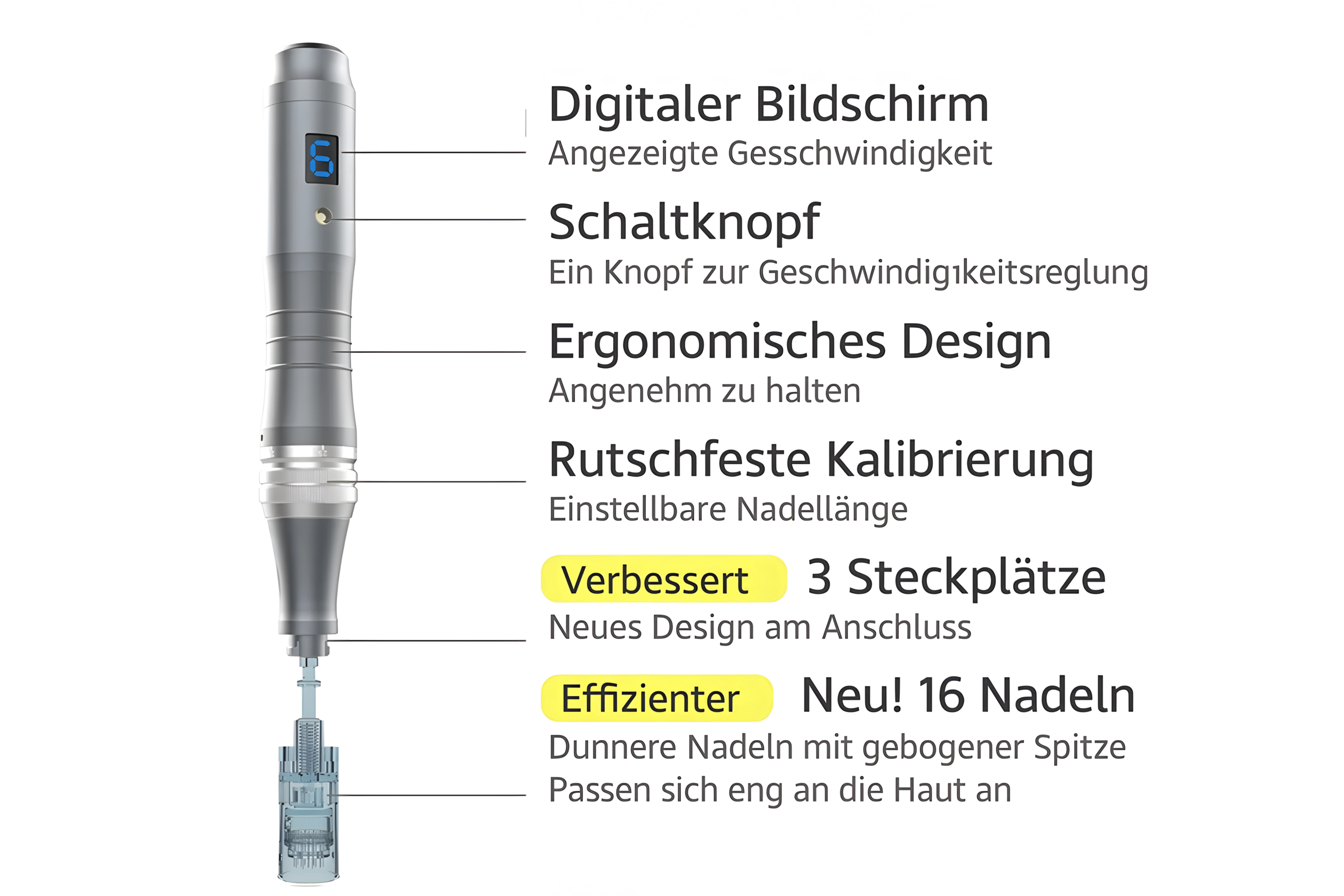 Der Dr. Pen Ultima M8 ist ein hochwertiges Microneedling-System für das Gesicht, das entwickelt wurde, um das Hautbild zu verbessern, indem es die Kollagenproduktion anregt. Er ist mit einem klaren LCD-Bildschirm ausgestattet, der die aktuelle Geschwindigkeitsstufe (6 Stufen) anzeigt – für eine einfache und präzise Anwendung.